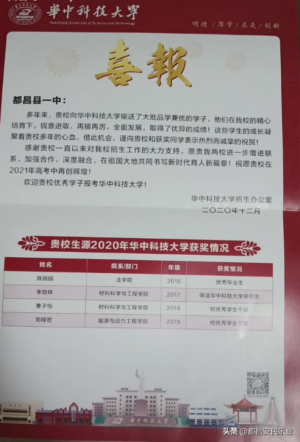 多年来,贵校向华中科技大学输送了大批品学兼优的学子,他们在我校的精心培育下,锐意进取,再接再厉,全面发展,取得了优异的成绩!这些学生的成长凝聚着贵校多年的心血,借此机会,谨向贵校和获奖同学表示热烈而诚挚的祝贺!感谢贵校一直以来对我校招生工作的大力支持,愿贵我两校进一步增进联系、加强合作、深度融合,在祖国大地共同书写新时代育人新篇章!祝愿贵校在2021年高考中再创辉煌!