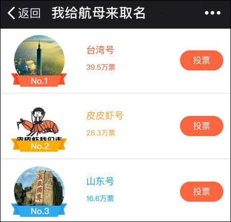 据悉,日前,网友在某网络平台发起国产首艘航母命名网络投票活动,其中,台湾号、皮皮虾号、山东号名列前三甲。