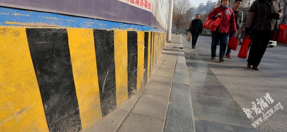 12月18日,河南郑州,行人从金水路上最窄的人行道旁边走过。在河南省郑州市金水路与通泰路交叉口的人行天桥下的郑州郑东新区如意湖办事处院外,有一处原本3米多宽的人行道由于拆房被施工单位用围 ...