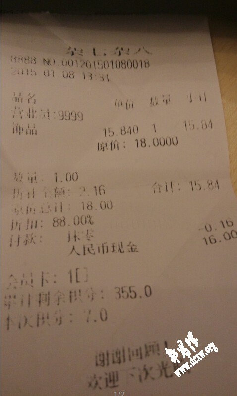 近日朋友陪我都昌县的杂七杂八买东西,原价是18元,折扣是0.88 。18*0.88=15.84 不应该是15.8元吗?可是收了我16元钱。还有的是我明明有会员卡,这下面的积分用的是谁的?听朋友说,大概是 ...