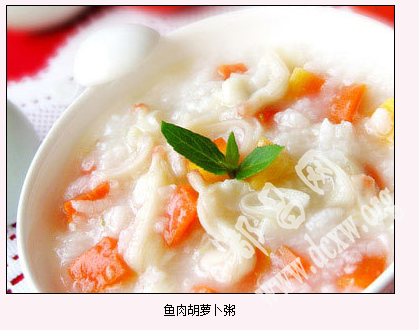 春季菜肴一: 鱼肉胡萝卜粥 原料:草鱼、胡萝卜、大米 佐料:香油、葱花、食盐 做法:1.选鲜活草鱼开膛去鳞洗净,取中段放入锅中加水大火煮开后,改小火煮炖30分钟捞出,去鱼皮和鱼油,挑净鱼刺,剁碎成泥状,备用; 2.胡萝卜切成小丁,和大米一同入锅加水,煮成软粥; 3.将鱼泥放入粥中,加入少许香油、葱花、食盐,即可食用。 |