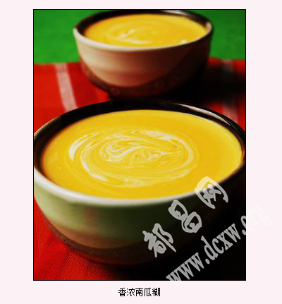 秋季菜肴二: 香浓南瓜糊 原料:南瓜、牛奶 佐料:肉汤、黄油 做法:1。南瓜去皮去子,煮烂后捣成泥状; 2。将南瓜泥、牛奶、肉汤放入锅中煮沸后,调转至小火煮至黏稠,出锅后加入黄油搅拌均匀,即可食用。 |