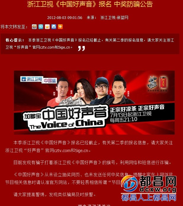 新蓝网8月3日讯 今天上午9时25分,福建宁德的赵小姐手机上收到一条中奖短信,告知她中了浙江卫视《中国好声音》的大奖,让她登陆指定的网站领取。赵小姐拨打浙江卫视的电话咨询,浙江卫视工作人员称《中国好声音》从 ...