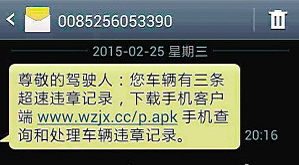 沫沫阿瑟网友爆料:一条看似好心提醒的短信,其实暗藏“杀机”。短信内容为“尊敬的驾驶人:您车辆有三条超速违章记录,下载手机客户端www.wzj*.**/p.apk手机查询和处理车辆违章记录。”这是一款伪装成A ...