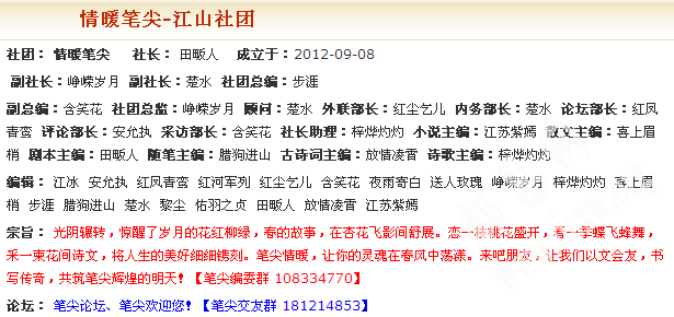 2015年4月15日,都昌本土作家田畈人正式出任江山文学网情暖笔尖文学社社长,并有意邀请家乡文学爱好者加盟笔尖文学社,让鄱阳湖文化走进江山文学 ...