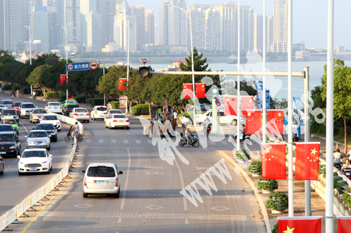 9月24日下午,走在南昌市抚生路、红谷滩赣江中大道等主要道路上看到,为了迎接国庆65周年,道路两侧悬挂起了五星国旗,一面面鲜艳的旗帜迎风飘扬,为市民带来了浓浓的国庆氛围,同时也营 ...