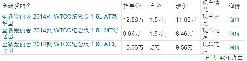 腾讯汽车讯,本周腾讯购车编辑从天津当地一家东风雪铁龙(微博)汽车经销商处了解到,最近东风雪铁龙全新爱丽舍现车销售,购东风雪铁龙全新爱丽舍最高优惠15000元,详情请到店咨询。车型售价如下表: