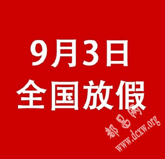 中国政府网通知:2015年是中国人民抗日战争暨世界反法西斯战争胜利70周年。为方便全国人民参与纪念活动,2015年9月3日全国放假1天。调休:9月3日至5日调休放假,共3天。其中9月3日(星期四)放假,9月4 ...