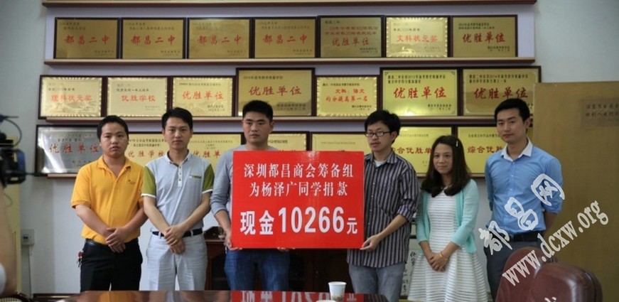 今天上午,受深圳都昌商会筹备组委托,在都昌二中举行捐赠仪式,现场为都昌二中患病学生杨泽广捐款10266元,并把钱交给杨泽广姐夫彭文峰手中。彭文峰说:“感谢深圳都昌商会筹备组对杨泽广的帮助,让 ...