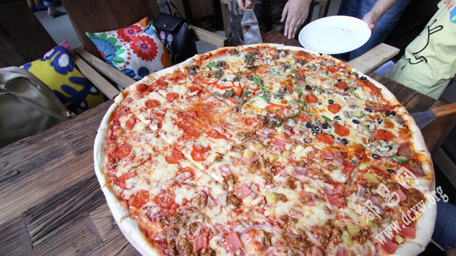 2015年05月18日,山东省滨州市,一家披萨店为配合一档亲子游戏节目特别制作了一张直径超过1.3米的超大披萨,足够25人分食。人们纷纷拿出手机拍下这一难得一见的景象