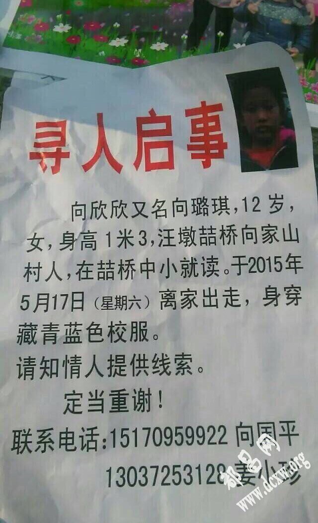 5月17日,在都昌汪敦喆桥中小上六年级的12岁女孩向欣欣离家出走后失联,家人四处寻找,都没能发现孩子踪影。22日,小孩家人通过都昌当地网站发布寻人启事,希望广大网友能够留意其孩子的 ...