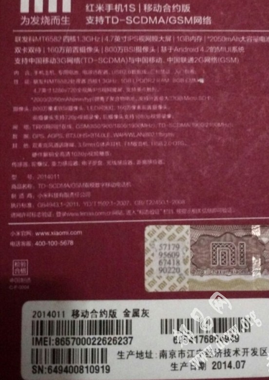出售一部红米手机1S,移动合约版。手机购买日期是2014.08.08。外观完好。8成新。手机8G内存。现300出售有意者私聊QQ774609048电话,18870222312.