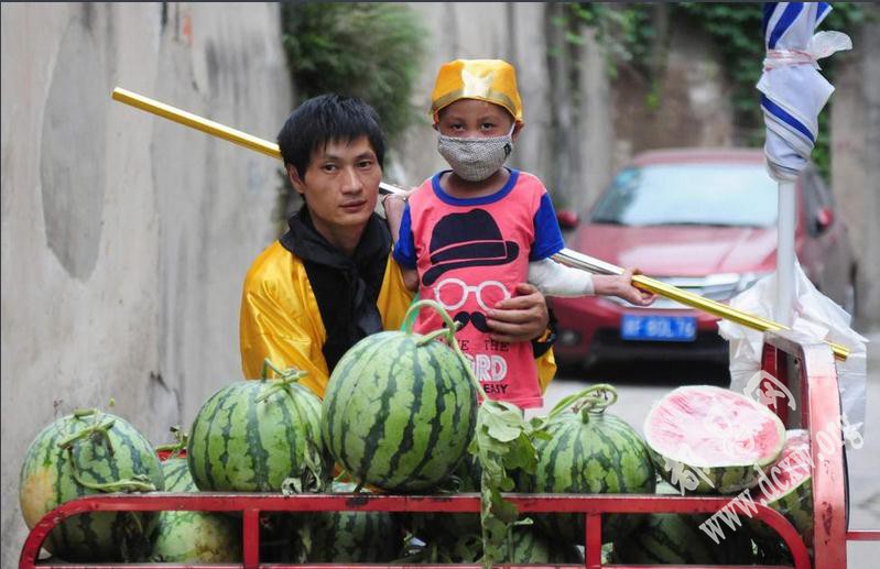 在合肥市红星路与宿州路交口,朱克良穿着孙悟空的衣服卖西瓜,只为了多挣点钱给儿子看病。