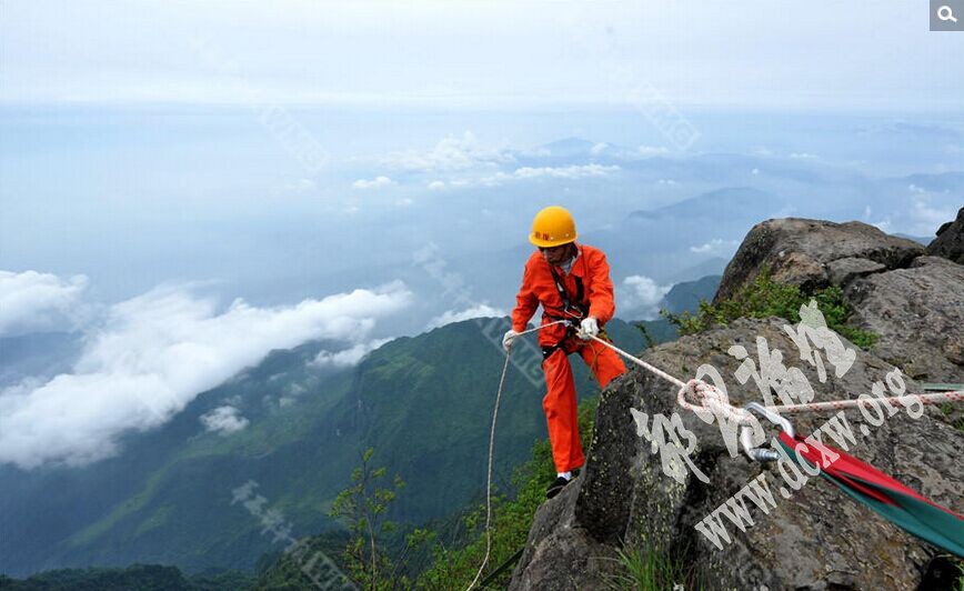 10月5日,峨眉山景区清洁工彭文才下到岩壁清理游客丢弃的垃圾。在海拔3079米的金顶舍身崖护栏外,彭文才已工作了14年,不久前成为“四川好人”候选人。