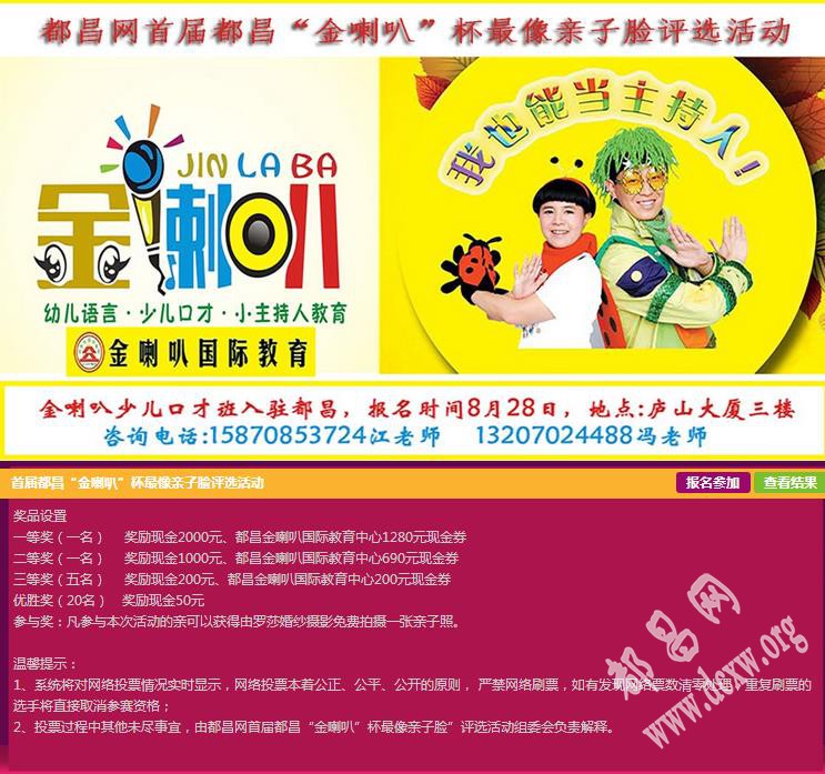 baobao 发表于 2015-8-25 11:24 微信关注都昌网微信公众号duchang7788 或dc5059998,发送“投票”,点击返回的活动链接,输入您的姓名、电话、亲情宣言、上传3到5张照片,点击提交即可,等待管理员审核生成投票。报名时间:即日起至2015年9月7日 投票时间:2015年9月1日9点至2015年9月8日9点。 |