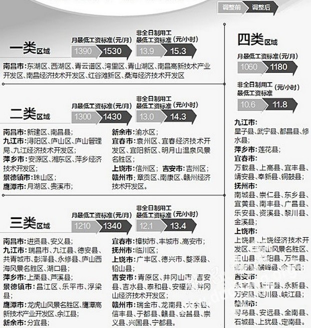 我省将调整最低工资标准,从10月1日起执行。这是我省自1995年5月1日实施最低工资制度以来,第10次调整。都昌属于四类区域,月工资最低标准将调整为1180元/月。