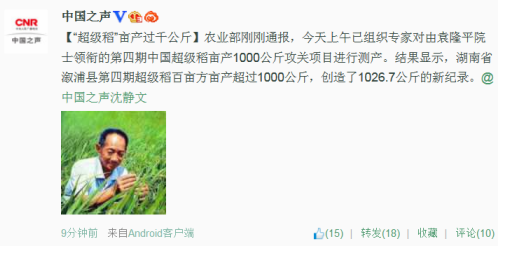 中新网10月10日电 据中央人民广播电台官方微博“中国之声”消息,农业部刚刚通报,今天上午已组织专家对由袁隆平院士领衔的第四期中国超级稻亩产1000公斤攻关项目进行测产 ...