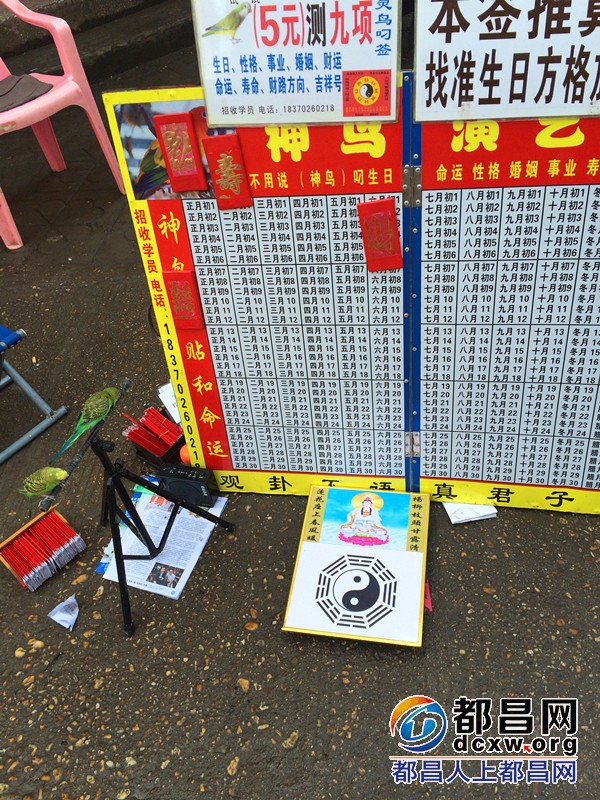 “神鸟叼签,叼婚姻、叼财运,叼事业,叼寿命……”,最近,有一位老人在路旁、在闹市摆着一个神鸟叼签摊,面前一块牌子,脚边一个小三脚架,上栖两只好看的小鸟。观众只要花上5元钱,用他的花板遮 ...