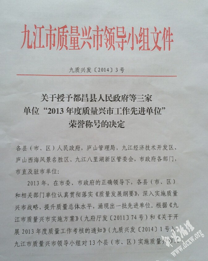 在2014年10月21日召开的全市质量质量兴市工作会议上,都昌县荣获九江市人民政府表彰的“2013年度质量兴市工作先进单位”。这是自2012年九江市实施质量兴市战略以来,都昌县继2012年获质量兴市工作先进单位之后,连续 ...