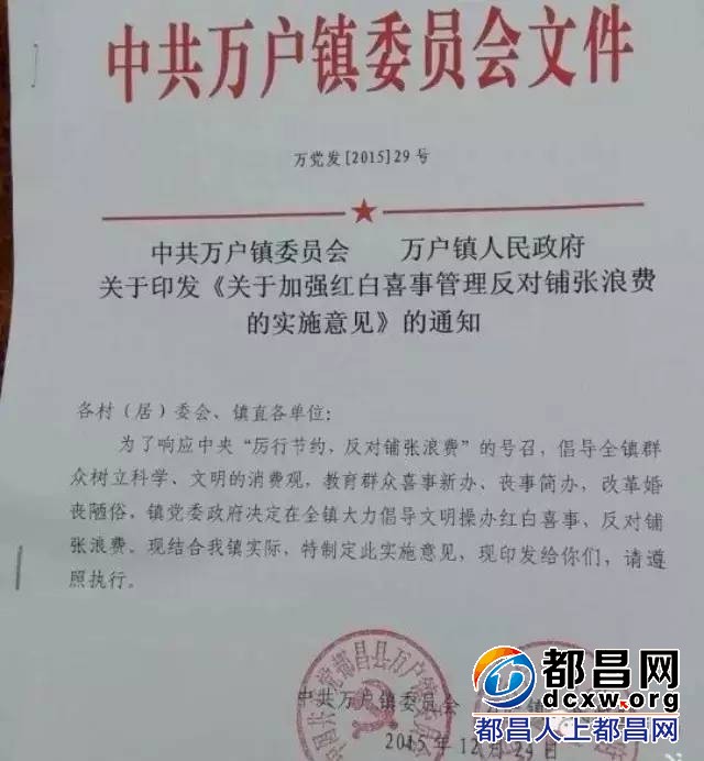 近日都昌万户刘钐村为响应国家"履行节约、反对浪费攀比之风"的号召,由镇政府发红头文件对红白喜事待客由提出意见,村理事会监督执行违者村民不帮工,不参加喜宴。菜谱标准:(不超过17个菜)禁止菜:甲鱼、青蛙 ...