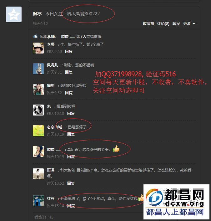 我一个朋友要进行沙龙讲座,现在是积累粉丝的阶段,如果有8个我推荐的人加他的话,就可以得到他的尾盘选股法。他空间每天也有新票推荐,这两天推荐的科大智能涨停,大家都可以去看看,不好再删除 要是觉得推荐的好 ...