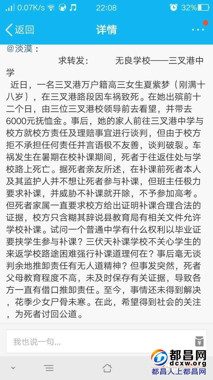 <<三汊港中学摊上大事儿了...女学生意外身亡 这事儿还没完...>>md,都昌天天有新闻 |