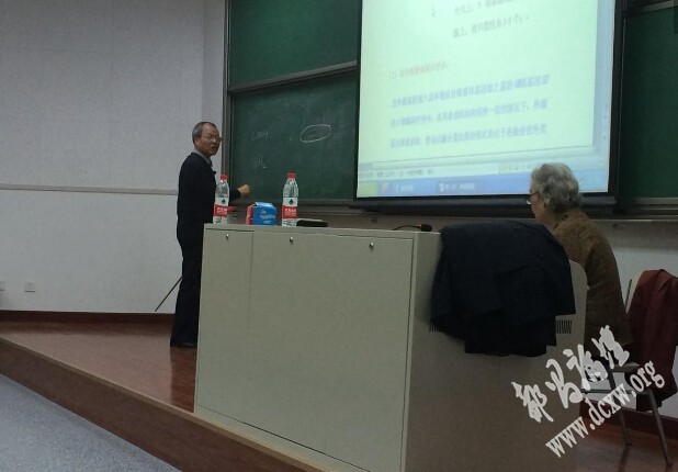 2014年10月29日,北京中国社科院一研究生课堂,一名老教授在上课,妻子坐在讲台上陪他一起上课。