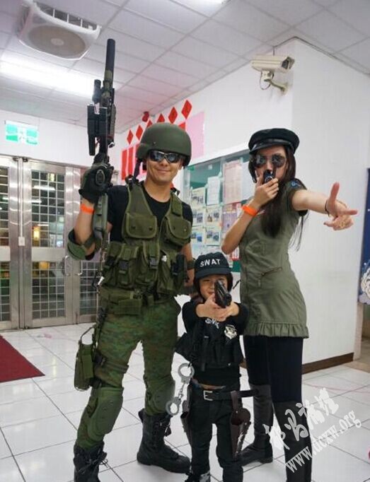 10月30日,林志颖和妻子参加儿子kimi学校的万圣节派对,一家人都穿着特警装扮。林志颖戴头盔,提枪,kimi则一身黑色特警装,手持手枪。