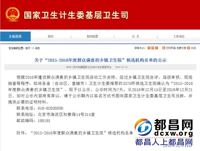 日前,国家卫生计生委基层卫生司发布了《关于“2015-2016年度群众满意的乡镇卫生院”候选机构名单的公示 》,九江20所乡镇卫生院进入候选机构名单。 “2015-2016年度群众满意的乡镇卫生院”九江 ...