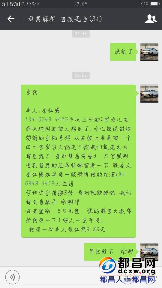 求转 本人:李红霞 184 0343 4493今天上午的2岁女儿在新天地附近被人拐走了,女儿能说出她妈妈的手机号码 从监控上看是被一个四十多岁男人抱走了现我们家老太太都急疯了 有知情者请告之 万分感谢 看到信息的兄弟姐 ...