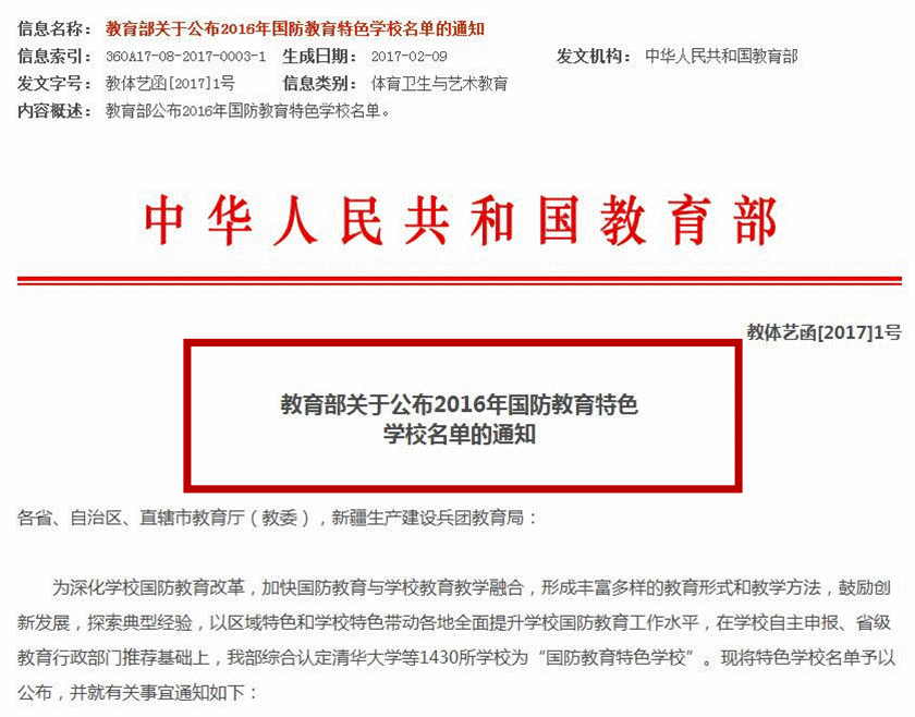 近日,教育部发布了一份关于公布2016年国防教育特色学校名单的通知▼ 恭喜这些上榜的学校 为你的母校ZAN一个吧~