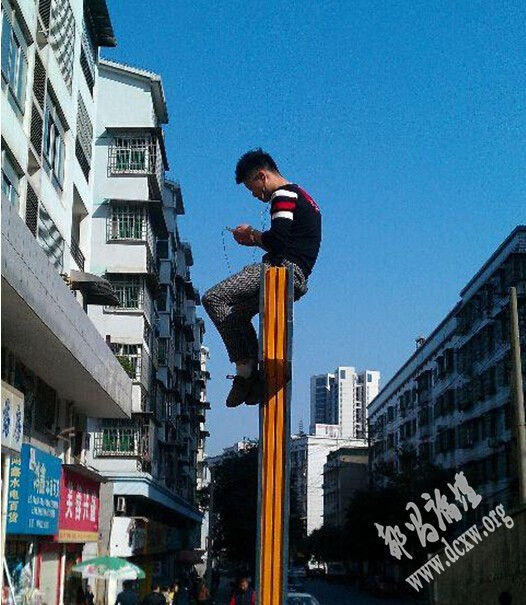 昨天,在天元区新闻路,一名小伙爬上一块3米多高的路牌,一边坐着玩手机,一边忘我地听着音乐。他仿佛已经忽略了下面车来人往,完全陶醉了。该小伙是旁边一家理发店的员工, ...
