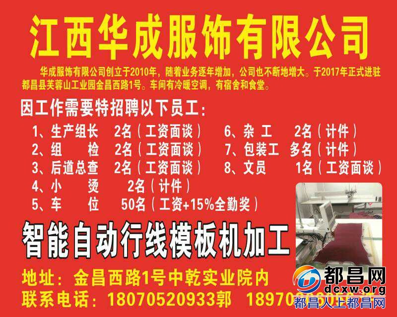 江西华成服饰有限公司 华成服饰有限公司创立于2010年,随着业务逐年增加,公司也不断地增大。于2017年正式进驻都昌县芙蓉山工业园金昌西路1号。车间有冷暖空调,有宿舍和食堂 ...
