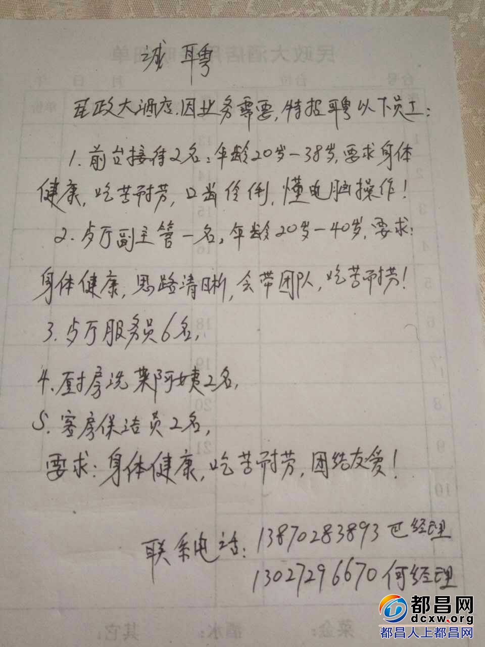民政大酒店,因业务需要,特招聘以下员工: 1.前台接待2名:年龄20岁-38岁,要求身体健康,吃苦耐劳,口齿伶俐,懂电脑操作! 2.餐厅副主管一名,年龄20岁-40岁,要求:身体健康,思路清晰,会带团队 ...