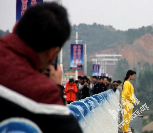 2014年12月6日下午,广西藤县西江大桥,一个穿黄色衣服的女子站在桥梁栏杆外,在距该女子约30米处挤满了围观的群众,这时已经有警员在场。(东方IC) 中国网12月8日讯 2014年12月6日下午,广西藤县一女子跳桥失踪, ...