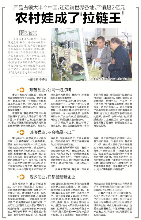 返乡助业,在都昌建新企业 在外闯荡多年,曹达平创业有成。从一个农村娃成长为“拉链王”,应该说是荣宗耀祖的事,但曹达平并未满足于此。他知道家乡还有一部人没有富起来,他的根在都昌,心里早有返乡助业的打算。一来都昌有216家服装厂,拉链是服装产业链的延伸,二来可以让都昌的父老乡亲实现家门口就业的梦想。当县长陈云滚2012年到他上海的公司考察,并力邀他返乡助业时,他非常爽快地应承下来,而且很快付诸行动,投资5000多万元在都昌县芙蓉工业园区建起了厂房,挂起了航顺拉链实业有限公司的招牌。182台机器设备安装到位后,迅速投入生产。每个车间都是全自动化生产线,从织带、染色、烫平、成型、缝合、贴胶、打孔、插销、穿头、包装全自动化生产。招工时他对贫困户子女做到优先录取,免费培训。从投产到现在才一年时间,便实现产值1000万元,产品供不应求。为了回报家乡,他主动捐献2万元给大沙慈善助学基金会救助贫困学子,并帮太阳村鄱阳湖儿童救助中心建起了浔阳晚报小记者站。 在曹达平看来,把企业做大做强,是返乡助业的最好方式。他打算把自己的企业继续做大做强。抓住沿海企业向中部转移的大好时机,继续延长服装产业链,并成立服装辅料总会,在现有拉链基础上,将纽扣等融入服装产业链上来,两三年内成为服装行业的龙头企业。 |